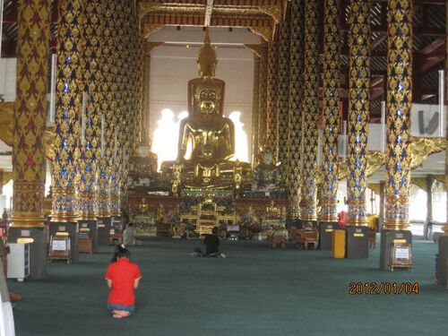 別の場所では又ひっそりとお祈りしている人もいる。ああ珍しい、この女性はきちんと正座をしている。 後ろ側の仏像。 眼もまばゆいばかりの装飾品。 金沢の金箔の最大の輸出先がタイと言うのも頷ける。 全く迷宮に足を踏み入れたようだ。 漸く外へ出る。 外…