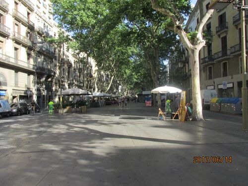 ランプラス通りは大きなプラタナスの樹木が茂り、広々した遊歩道になっている。 通りの中程、カタルーニャ広場寄りに、ガウディの旧居がある。 時間が早く、建物内に入れないのか、外から眺め写真を撮っている韓国人らしき若者のグループがいた。 ガウディ邸…