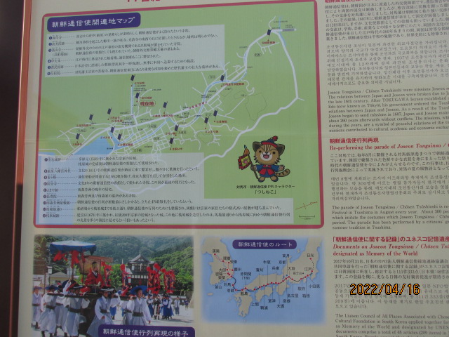 町の中心の交差点近くに厳原周辺の案内図が掛かっていた。地図の下には朝鮮通信使の再現行列の写真があった。